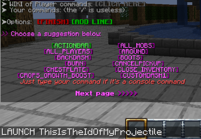 Let's go back to the activator PLAYER_RIGHT_CLICK of our item, and in commands we are going to use the LAUNCH command, the format is